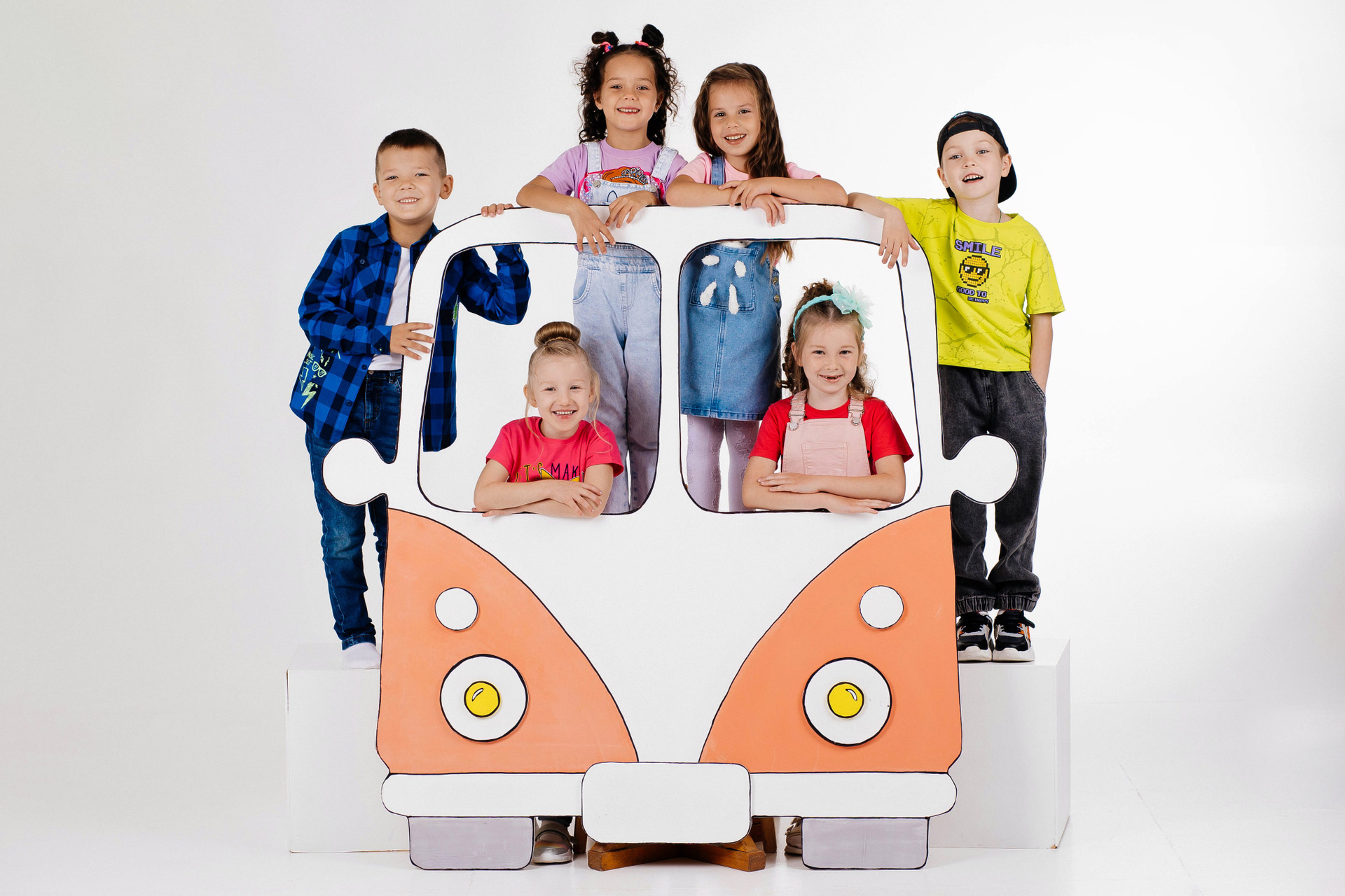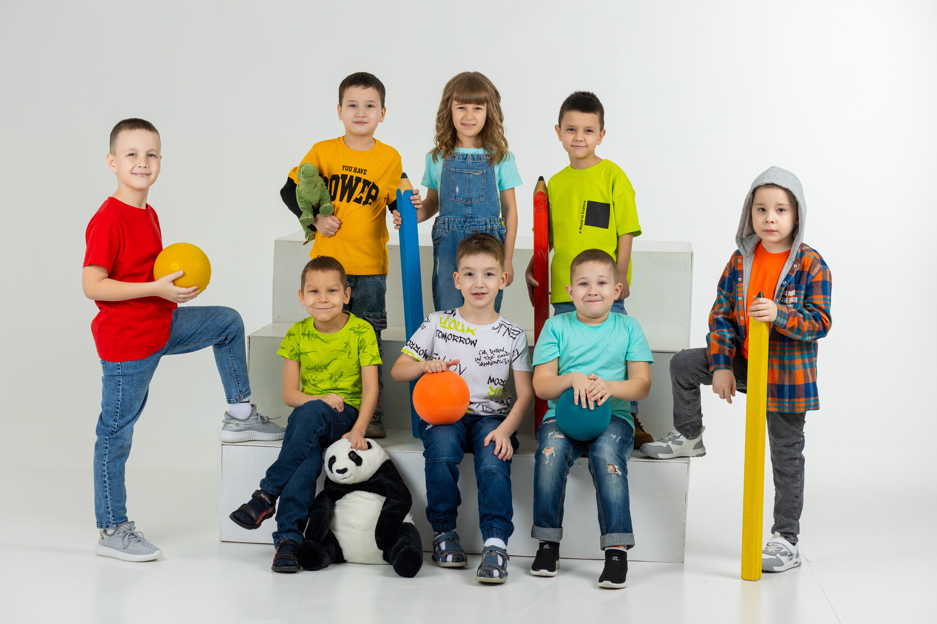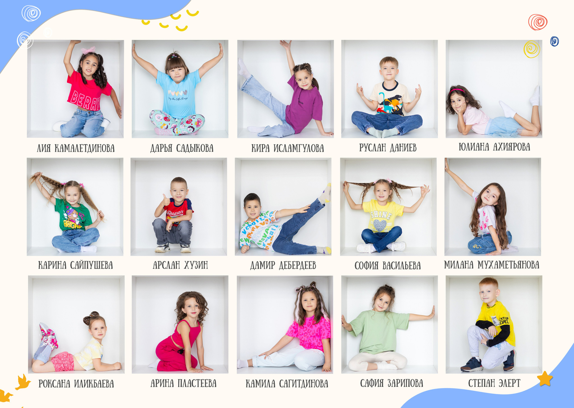— Детки в кубиках с подписанными именами и фамилиями в свободной яркой одежде
